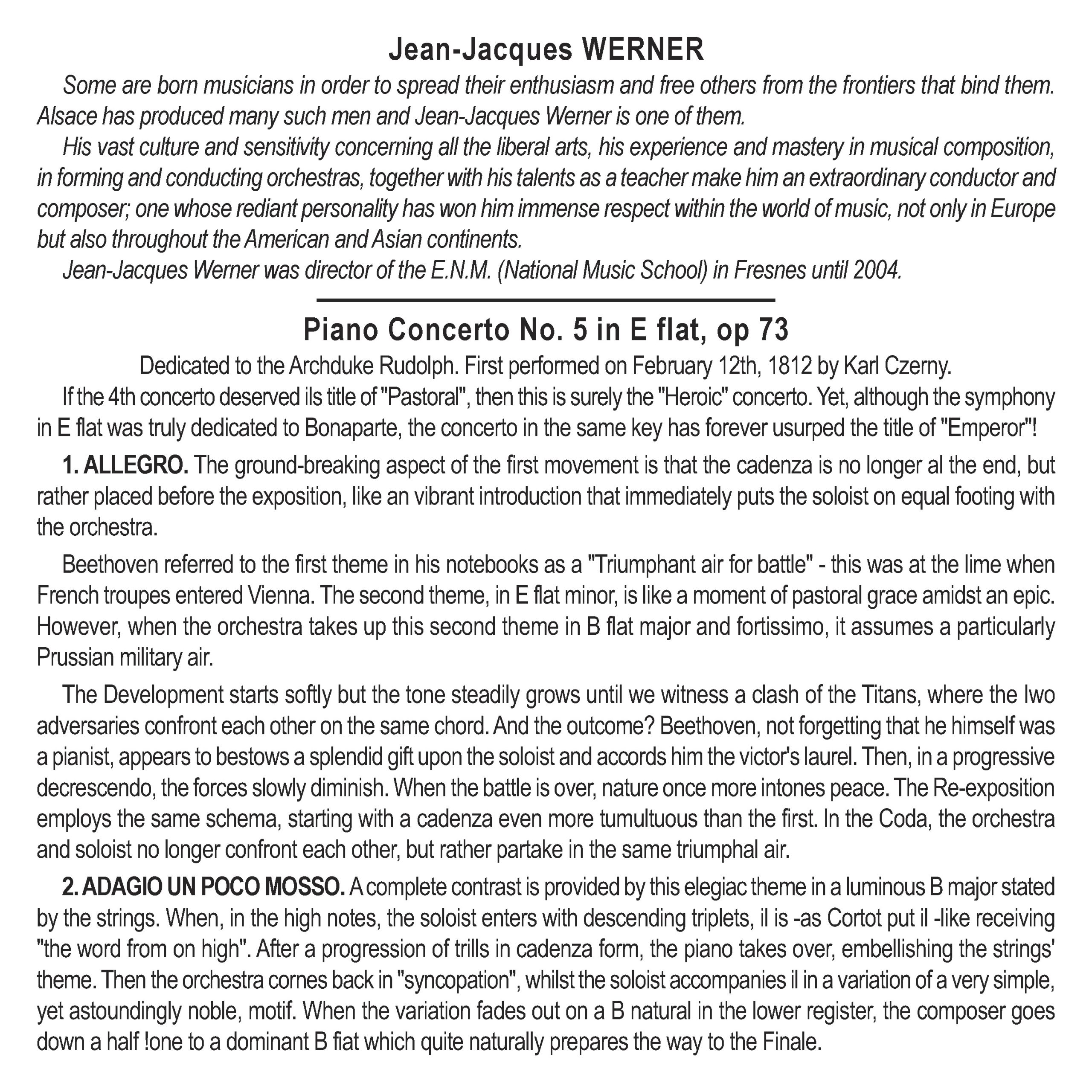 5ème concerto en mi bémol majeur, op. 73. Dédié à l’Archiduc Rodolphe. Première audition le 12 février 1812, par Czerny. Si le 4ème concerto méritait le titre de Concerto « Pastoral », à plus forte raison, voici notre concerto « Héroique ». Mais si la symphonie en mi bémol a été dédiée pour de bon à Bonaparte, le concerto écrit dans le même ton a, pour la postérité, usurpé le titre « d’Empereur »! Parmi les 70 concertos (pour 1 ou 2 pianos) qu’Eric Heidsieck a joué dans sa carrière, L’Empereur figure à la première place !